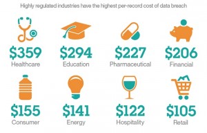 Despite the costly hit taken by the Target corporation, it turns out that retail organizations have the lowest per-record cost of data breach versus many other organizations. Generally speaking, the more highly regulated an industry is, the more costly the data breach – per record — will be. See the graphic showing the average cost per record breached by industry to gauge your potential threat.